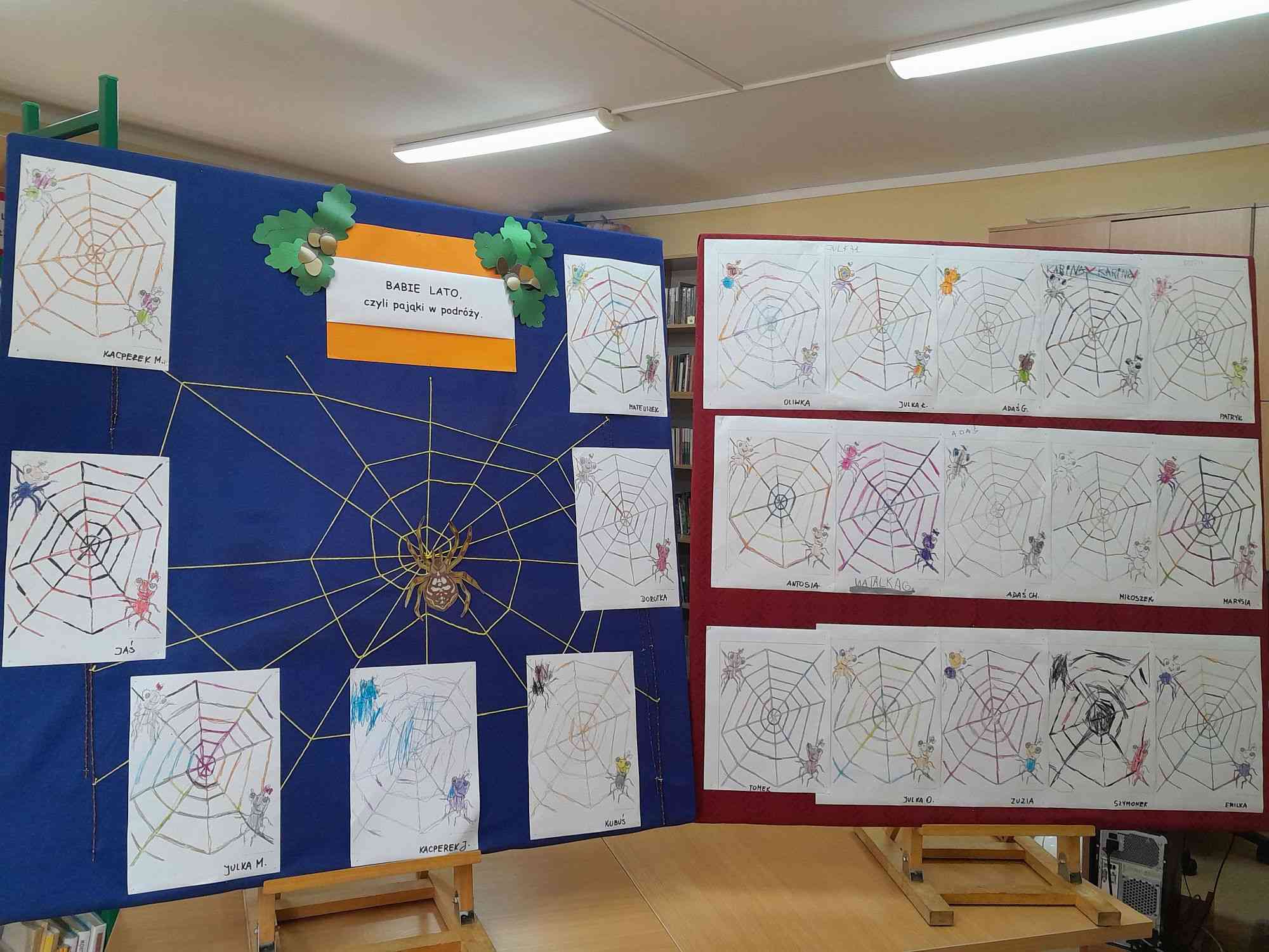Na zajęciach plastycznych przedszkolaki rysowały babie lato, czyli pająki w podróży. Z prac powstała wystawa, która ozdabia witryny biblioteki w Grojcu.