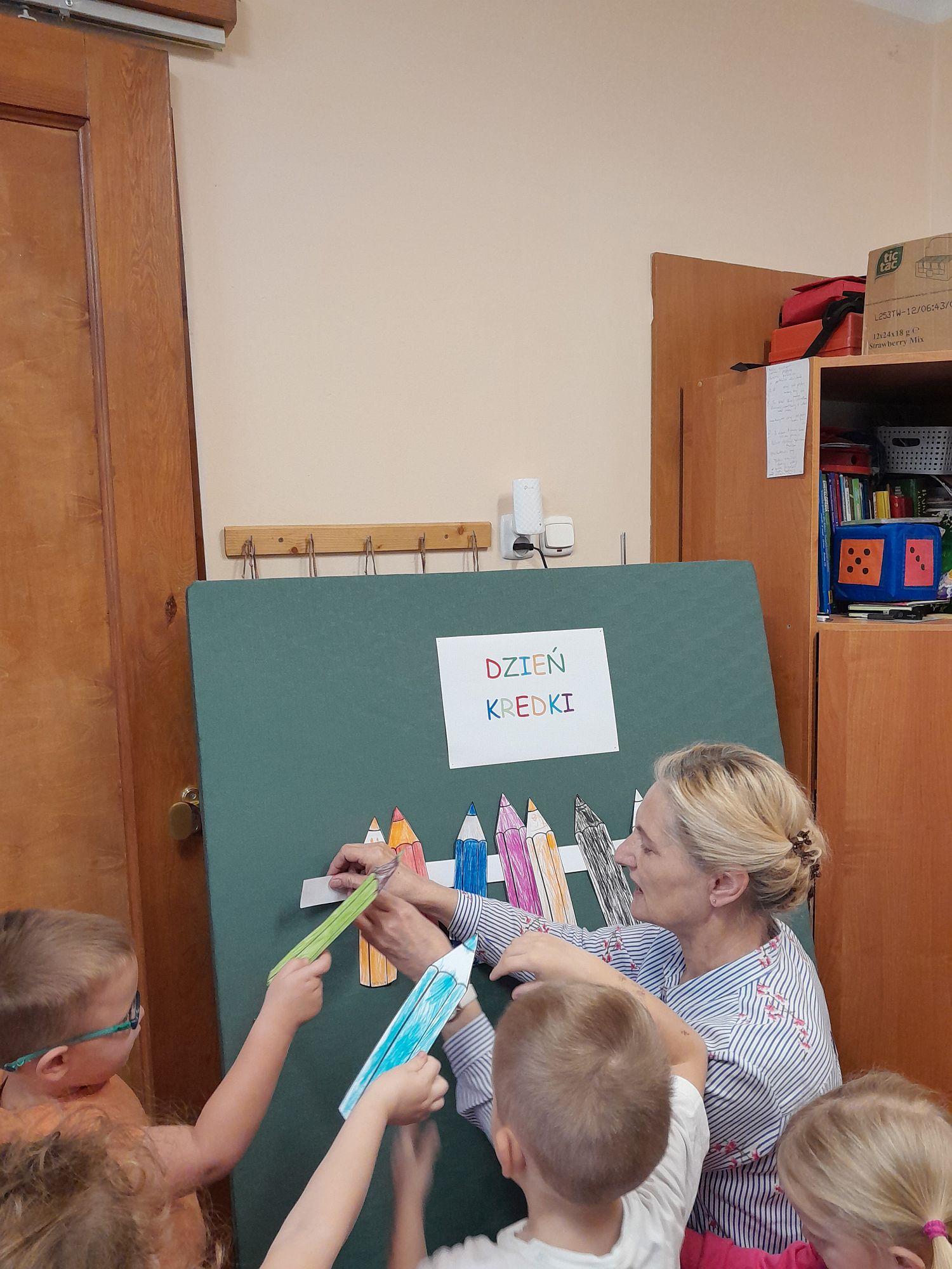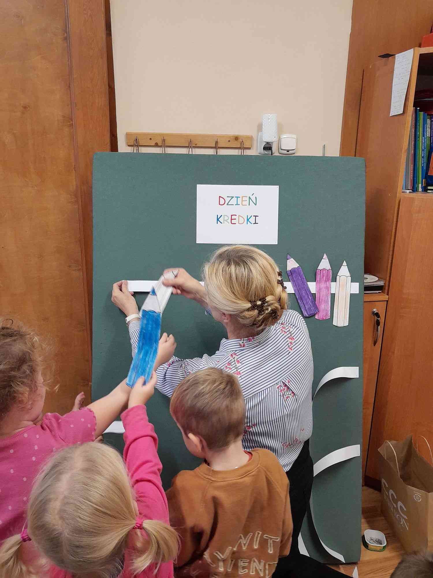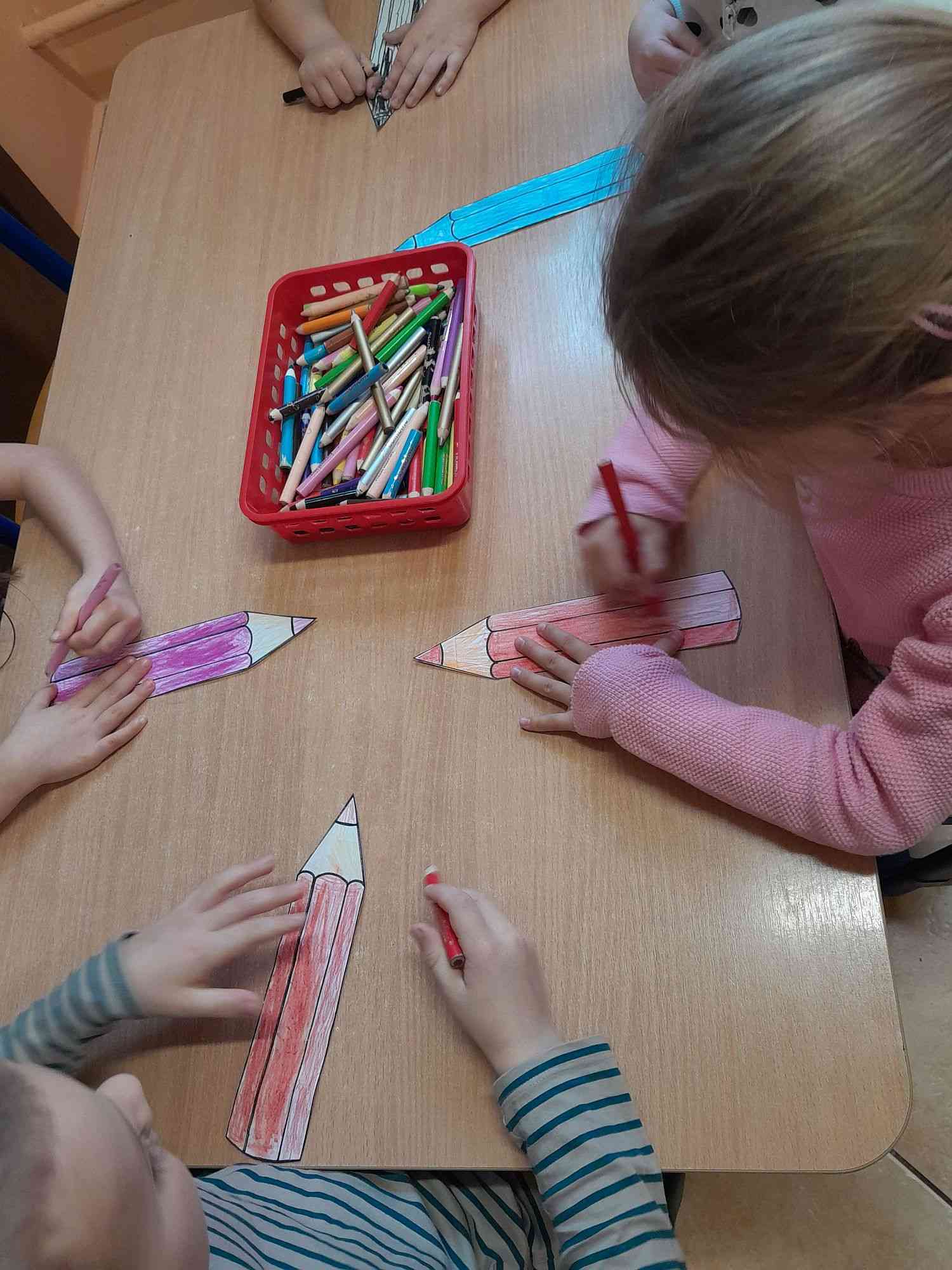 Dzieci poznały wiersz Kamili Bednarek pt.”Kredki” i wysłuchały opowiadania Agnieszki Galicy pt.”Bajka o zielonej kredce”. Zadaniem dzieci było kolorowanie gotowych szablonów kredek, które zostały później podzielone wg kolorów i policzone. Na zakończenie przy dźwiękach piosenki „Kolorowe kredki” wspólnie układały barwny kredkowy płotek.