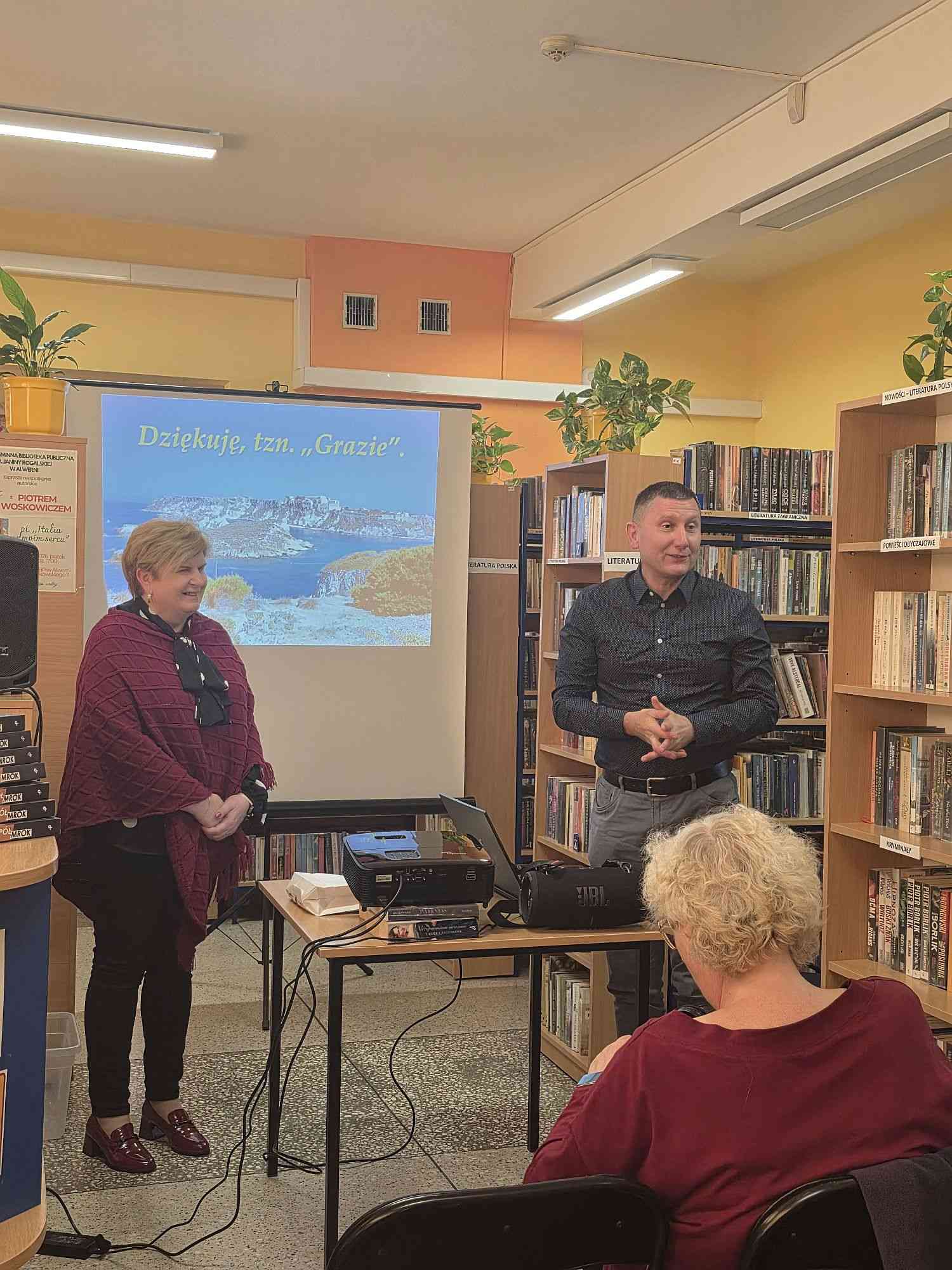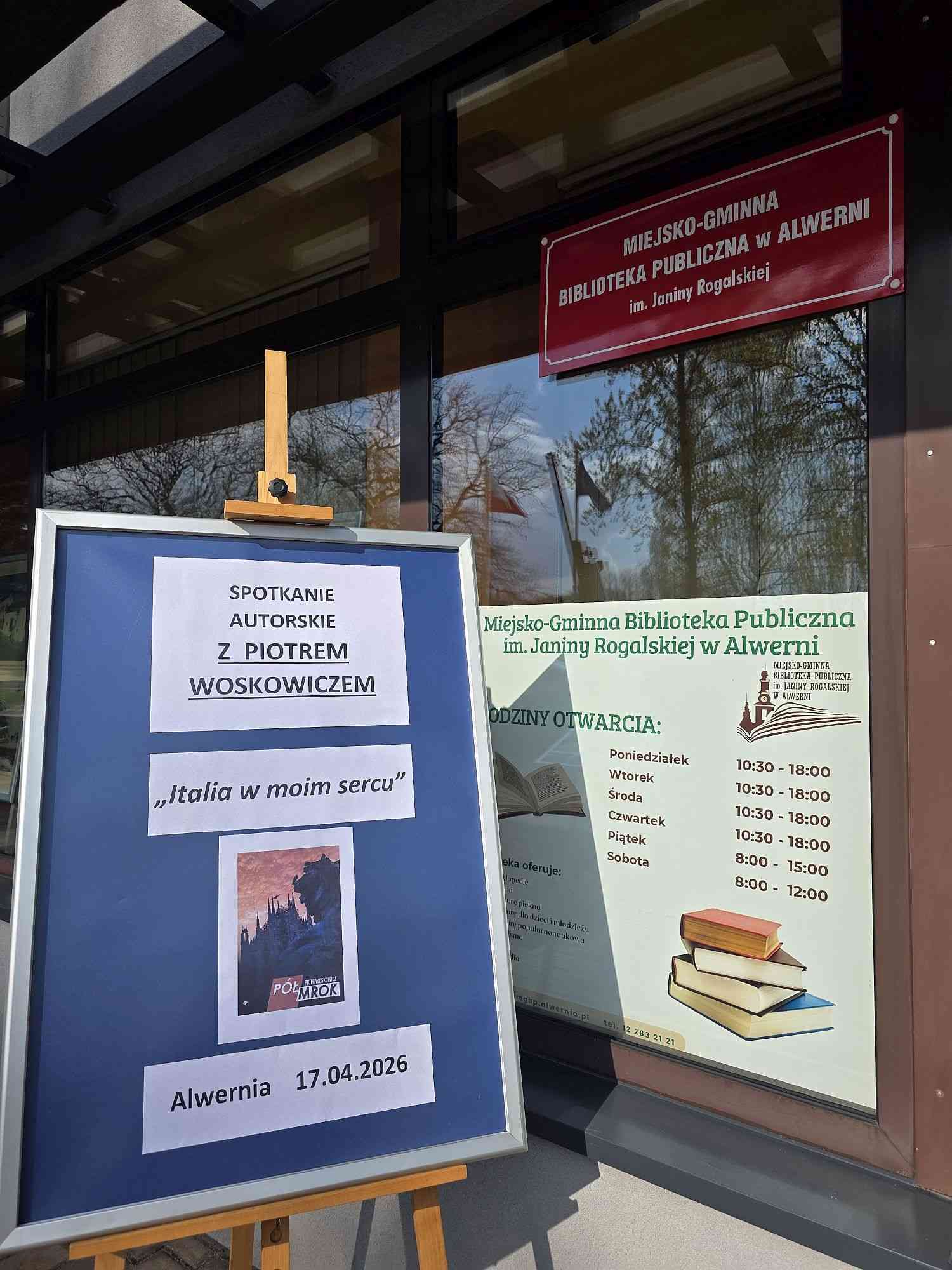 W piątkowe popołudnie, 17 kwietnia 2026 roku w Miejsko-Gminnej Bibliotece Publicznej w Alwerni odbyło się wyjątkowe spotkanie autorskie z Piotrem Woskowiczem – autorem debiutanckiej powieści „Półmrok” oraz pasjonatem podróży, szczególnie do ukochanej Italii.