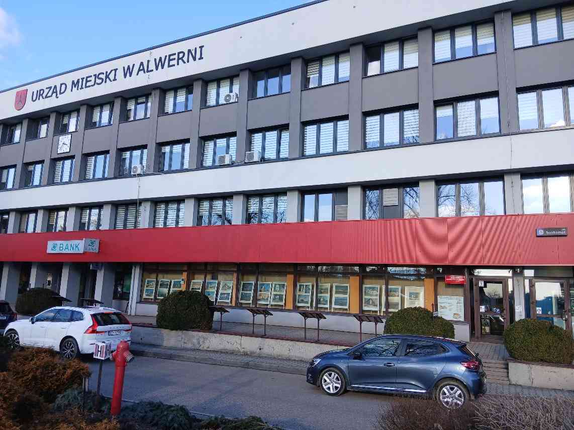 Zdjęcie przedstawia budynek Urzędu Miejskiego w Alwerni, w którym mieści się lokal biblioteki od strony ulicy Gęsikowskiego